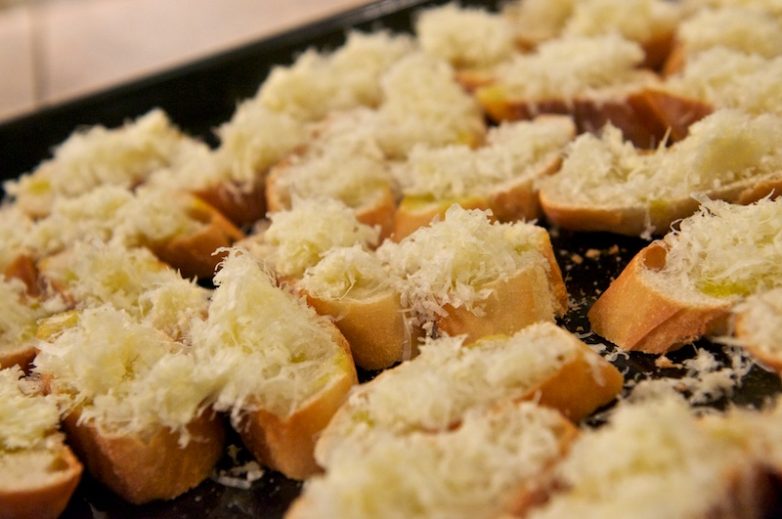 В огнеупорную супницу положите хлеб, нарезанный тонкими ломтиками и слегка подсушенный. Между слоями хлеба разложите половину тёртого сыра. Попробуйте на вкус бульон — если нужно, посолите и поперчите. Влейте бульон в супницу. Обильно посыпьте поверхность супа оставшимся тёртым сыром. Поставьте супницу в горячую духовку. Под действием высокой температуры сыр должен расплавиться, образовав корочку приятного золотистого цвета.