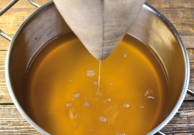И вот в таком состоянии — бурном брожении мезги и сока — грушевое сусло с периодическим перемешиванием лучше подержать недели две и только затем приступить к его грубой фильтрации, аккуратно сняв сначала шапку мезги, не особо не баламутя бродящий сок.