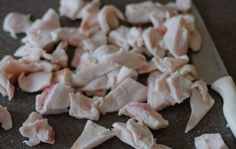 Баранье сало хорошо промываем под проточной теплой водой и после – выкладываем его на разделочную доску. С помощью ножа нарезаем на небольшие по величине кусочки и сразу же перекладываем в глубокую миску. Внимание: размер кусочков сала должен соответствовать размеру кусочков мяса для шашлыка.