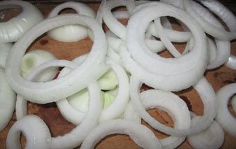С помощью ножа очищаем лук от шелухи и после – промываем под проточной водой. Выкладываем овощ на разделочную доску и нарезаем его кольцами. Измельченный лук перекладываем в свободную тарелку.