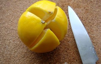 Лимон промываем под проточной водой и после – перекладываем на разделочную доску. Воспользовавшись ножом, разрезаем цитрус на четыре части и после – перекладываем лимонные кусочки в чистую тарелку.