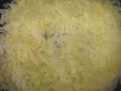 Разогреть масло, положить чеснок и капусту, прикрыть крышкой и обжарить ~10 мин (до мягкости)
