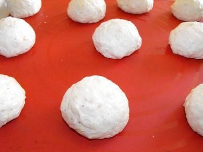 Посыпать пергаментную бумагу мукой, или манной крупой, или кукурузной мукой и разложить булочки на расстоянии 4-5см друг от друга ( я и булочки сверху немного посыпала мукой). Я не использую пергамент, т.к. выпекаю на силиконовом коврике