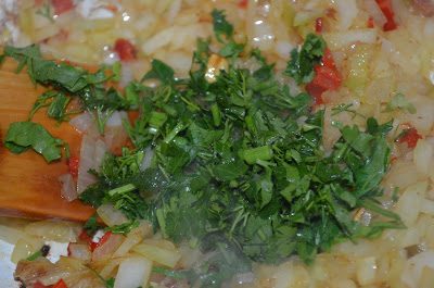лук и перец чили мелко нарубить, обжарить овощи на беконовом жире, добавить рубленую зелень и все перемешать. Оставить остужаться!