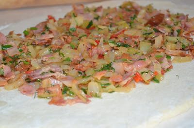 тесто раскатать в прямоугольник толщиной 1 см, на него в центр выложить начинку, от краев оставить по 5 см…