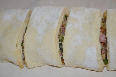 смазать края желтком и завернуть рулетом, нарезать на 6 кусочков