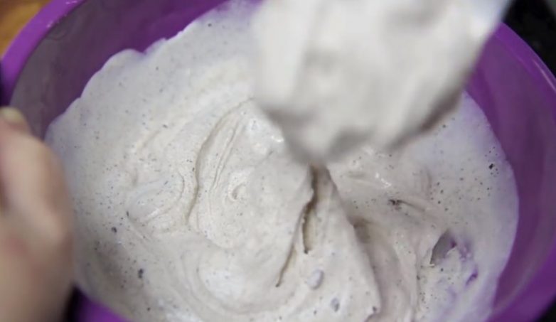 Затем смешайте муку, разрыхлитель и шоколадную крошку с мороженым.