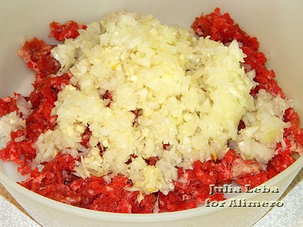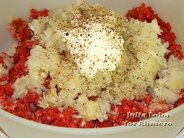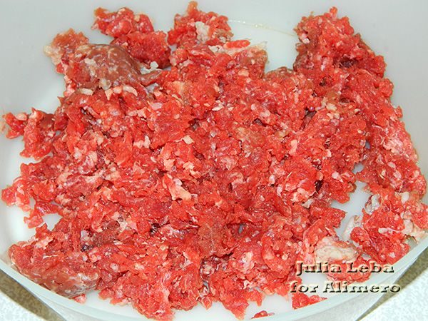 Размороженный кусочек говядины промыла холодной водой. Пропустила через мясорубку. Хорошо бы сделать смешанный фарш — свинина плюс говядина, 50/50, но у меня такой возможности не было.