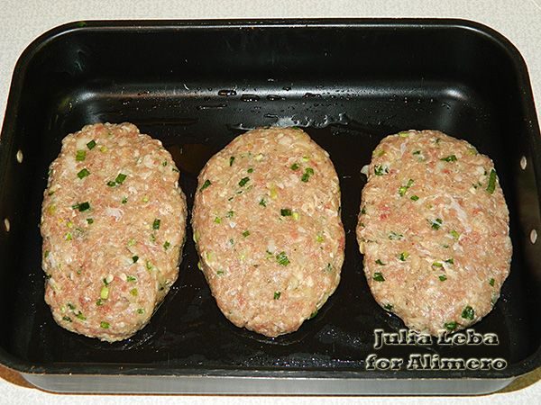 Подготовила форму нужного размера, смазала её подсолнечным маслом. Фарш разделила на три части. Из каждой сформировала большую овальную лепёшку. Аккуратно выложила их в форму.