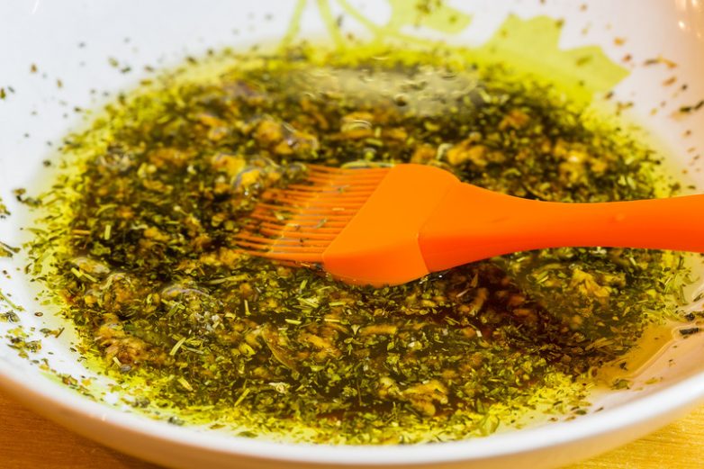 Смешать соевый соус, масло, травы и давленный чеснок.