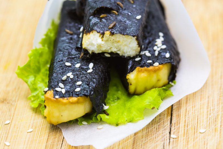 Листы нори ножницами разрезать пополам или согнуть и разломать по линии сгиба, опустить на несколько секунд в соус, чтобы они размягчились, и 1 раз обмотать ими каждый кусочек сыра.