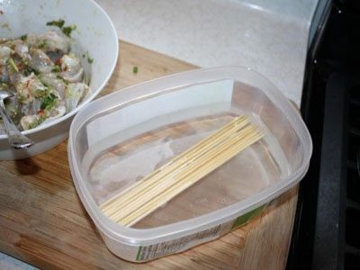 По истечении нужного времени удаляем миску с креветками из холодильника, снимаем с нее полиэтиленовую пищевую пленку и одеваем креветки на вымоченные бамбуковые шампура по 2 – 3 штуки.