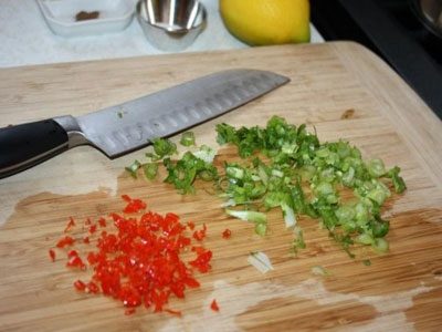 Теперь приступаем к приготовлению маринада! Сперва, при помощи кухонного ножа чистим от кожуры кусочек свежего имбиря, у лука срезаем корневище, у острого перца удаляем плодоножку и потрошим его от семян. После промываем ингредиенты под холодной проточной водой вместе с лимоном и сушим их бумажными кухонными полотенцами, таким образом, избавляясь от лишней жидкости. Затем откладываем лимон с имбирем в сторону, они понадобятся позже, а перец с луком поочередно кладем на разделочную доску, шинкуем на мелкие кусочки произвольной формы и перекладываем нарезку в глубокую миску.