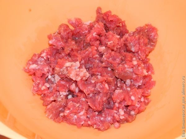 Мясо моем, жирок оставляем, а пленочки снимаем — они не нужны, будут только забивать мясорубку. Проворачиваем говядину в однородную массу.