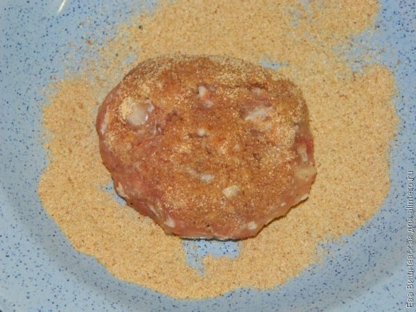 После этого обваливаем котлетку в панировочных сухарях. Густо или слегка присыпать — это уже по нашему желанию.