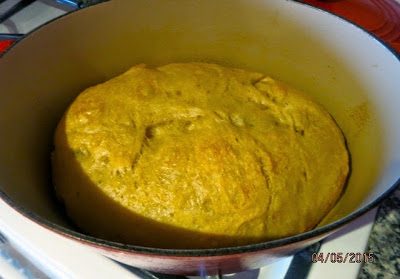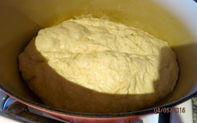 Через полтора часа (т.е. за полчаса до выпечки хлеба) разогреваем духовку до 230 C (450 F) со стоящей в ней чугунной жаровней (или другой хорошей толстостенной огнеупорной формой с крышкой.)
