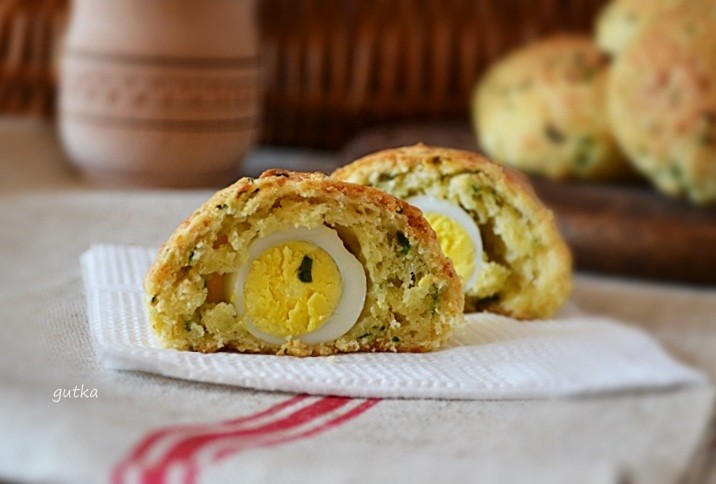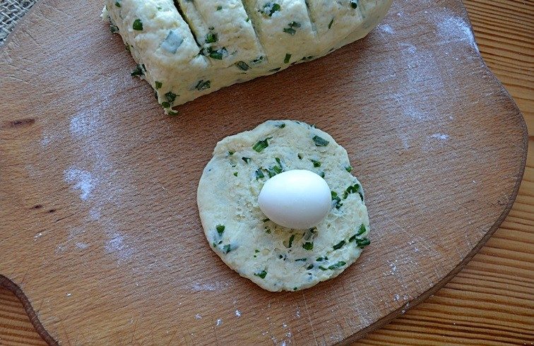 Тесто разделить на 6-7 равных частей, из которых формировать небольшие кружочки теста, сверху вертикально ставим яйца и формируем булочки.