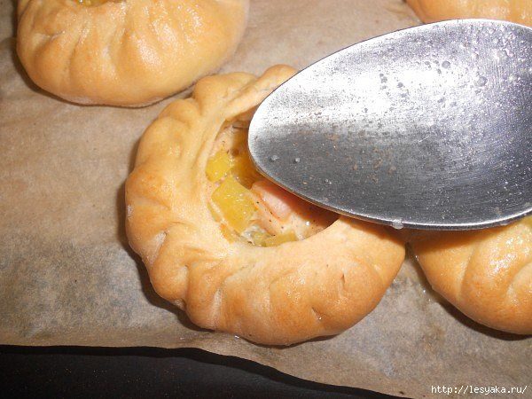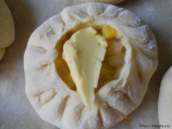 Пирожки выкладываем на противень, застеленный пекарской бумагой и отправляем в духовку, разогретую до 200 С. 8. Через 20 минут заглядываем в духовку. Внутри пирожков появилась жидкость. Теперь в каждый пирожок кладем по кусочку сливочного масла. И отправляем опять в духовку.