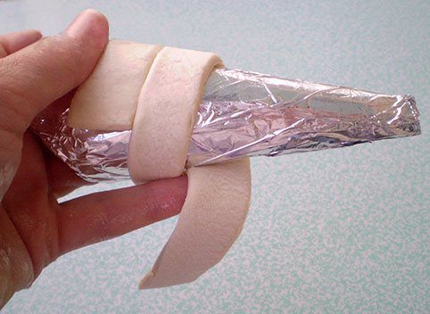 обвернуть трубочку полоской теста / спиралью /.