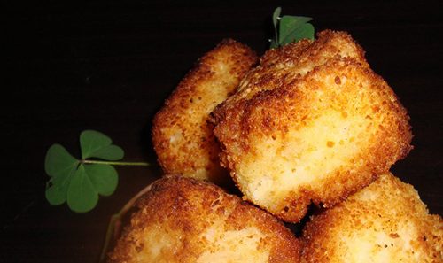 Разогрей сливки и смешай их с тертым сыром. Помешивай массу, пока не расплавится сыр. Затем добавь рис и перемешай. Выложи рис в форму, хорошенько спрессуй и поставь в холодильник до остывания. Когда остынет, порежь на кусочки любой формы. Перед тем как их пожарить, каждый кусочек необходимо обвалять сначала в муке, затем в яйце, затем в панировочных сухарях. Обжарь со всех сторон до золотистой корочки.