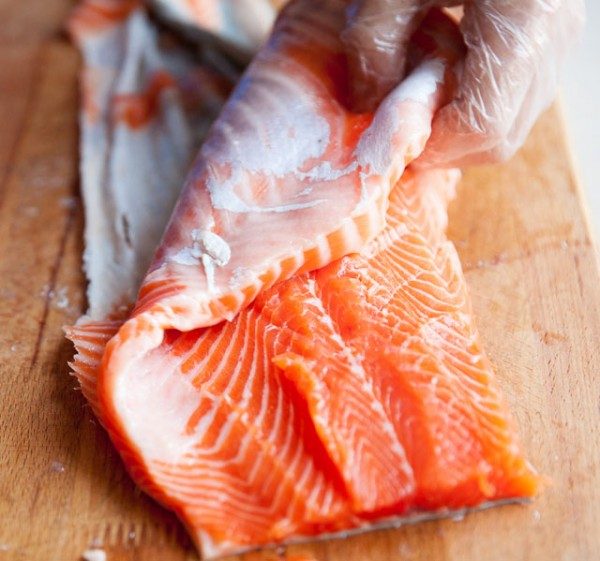 Берём лосося. Любого. По мне, так чем жирнее — тем лучше. Убираем голову и снимаем филе. Хребет, кости и кожа не нужны.
