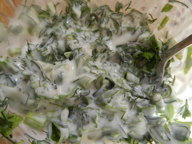 Смешиваем йогурт, отложенный для соуса, и мелкорубленую зелень. Убираем в холодильник. К тому времени, как мясо замаринуется, зелень пропитает йогурт.