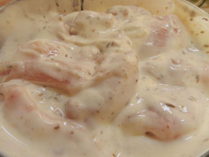 Смешиваем йогурт и толчёные пряности. Заливаем курицу и убираем в холодильник часа на три-четыре.