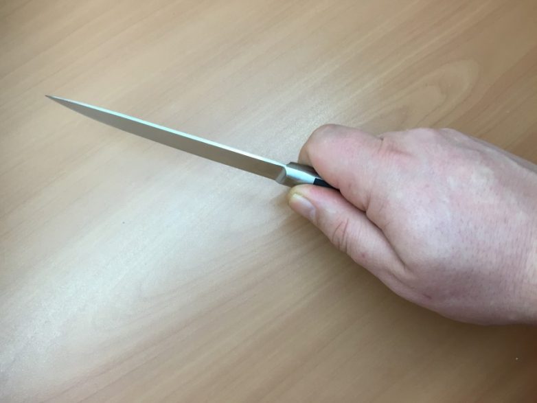 Но, эта особенность имеет свой минус – сделать коренчатым ножом красивый рез практически невозможно – лезвие всегда будет «гулять». Сравните резы, например, по ветчине – от шеф-ножа, от слайсера, от японского длинного клинка и от коренчатого ножа. Коренчатый нож приспособлен к резу «туда-сюда», он слишком короток. Это – еще одна его особенность.