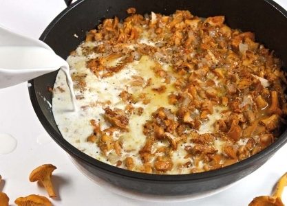 Тщательно перемешаем и помешивая, продолжим жарку в течение не более 4-5 минут, пока не начнется обильное выделение влаги. Тут же вольём в грибы 200 мл сливок — 10- или 20-процентных.