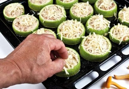 Аналогичным образом поступим со всеми кабачковыми шайбами и колечками, уложив затем по сути уже кабачковые кокотницы на смазанный растительным маслом противень. «Кокотницы» слегка посолим и столь же слегка поперчим свежемолотым черным перцем.