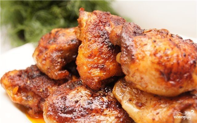 Затем помещаем курицу в разогретую до 180 градусов духовку на 35-40 минут. Для наилучшего результата курицу надо время от времени поливать собственным соком, который будет из нее вытекать, при помощи ложки. Готовую курицу можно украсить зеленью и подавать с любым гарниром.