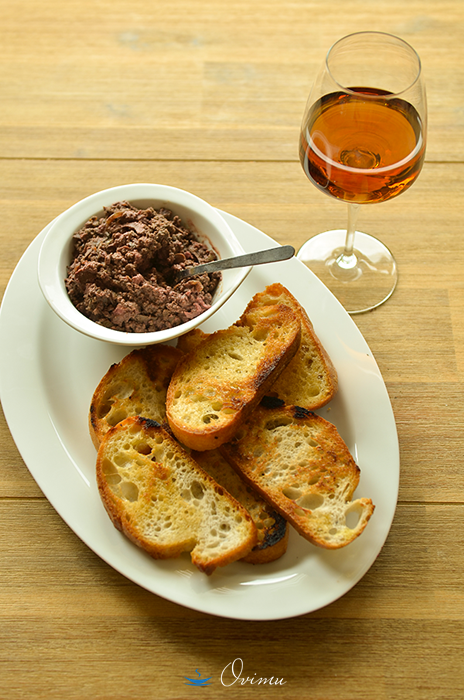 Шерри добавляем к печени и прокручиваем измельчитель несколько раз, чтобы была не паштетная, а мелко резанная структура. Очень хорошо к такой печени подходят гренки.