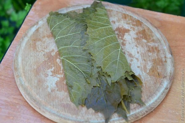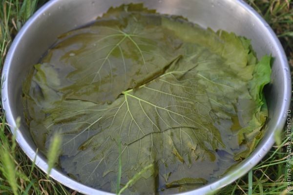 Воду после вымачивания сливаем, а виноградные листья заливаем кипятком на 1 минуту. Дольше держать листья в кипятке не стоит, чтобы они не сварились окончательно и не развалились.