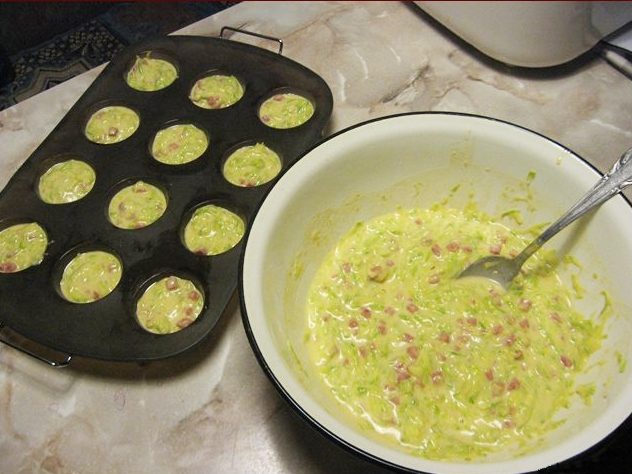 Кабачок 300-350 г очистить от шкурки (если надо), натереть на крупной терке, посолить-перемешать и оставить в друшлаге, чтобы стекла жидкость, хорошо отжать. Смешать 2/3 стакана муки, 2 яйца, 1,5 ч.л. разрыхлителя, 1-1,5 ч.л. сахара, добавить кабачок, перемешать. В тесто добавить 70-100 г мелкопорезанной копченой колбаски.