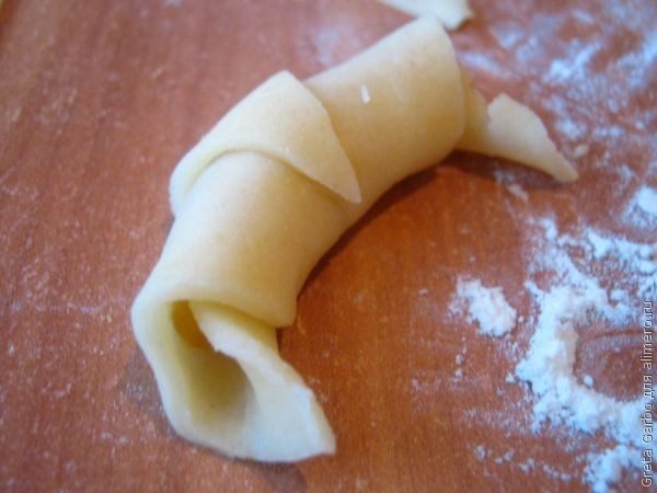 Затем, начиная с широкой части, сформировала рогалик, скатывая треугольник рулетом и слегка заворачивая рожки рогалика друг на друга, чтобы получилось подобие полумесяца.