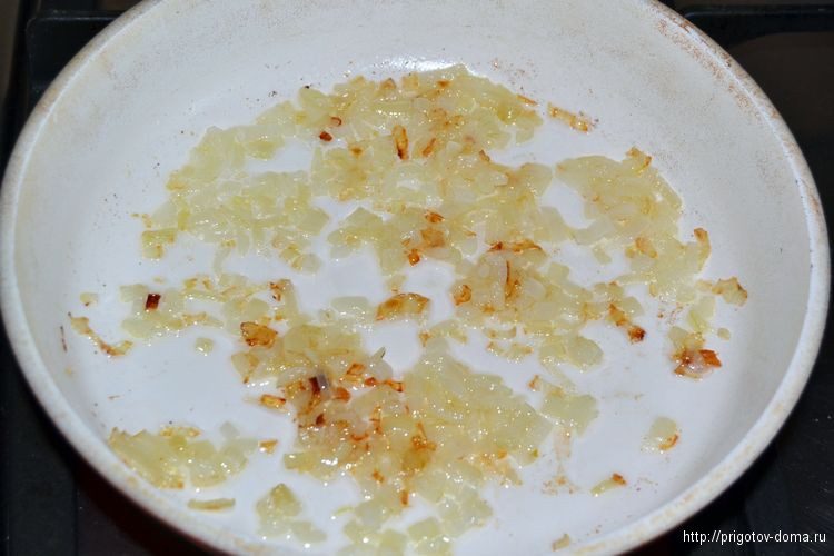 Репчатый лук измельчаем и обжариваем в растительном масле до легкого золотистого цвета. Сильно его зажаривать не нужно!