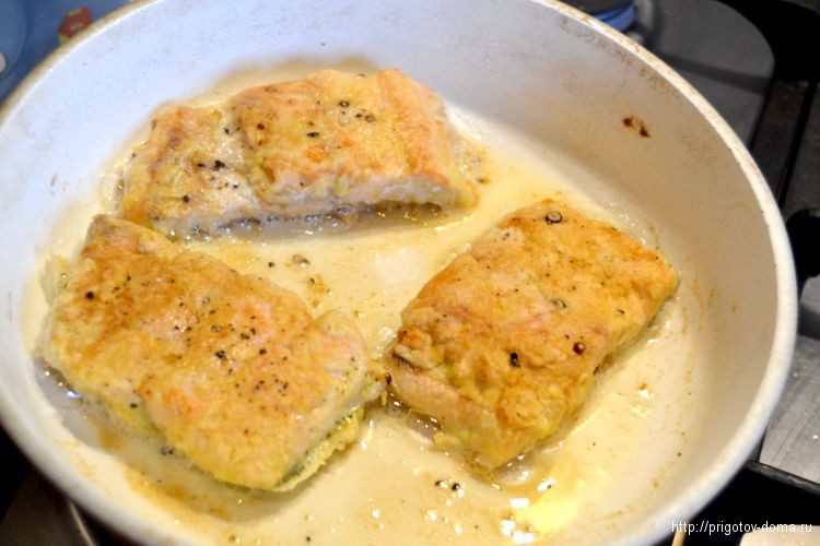 Выкладываем рыбку на сковороду с растительным маслом. Не забываем при этом ее посолить и поперчить. После рыбу обжариваем с двух сторон до образования румяной корочки.