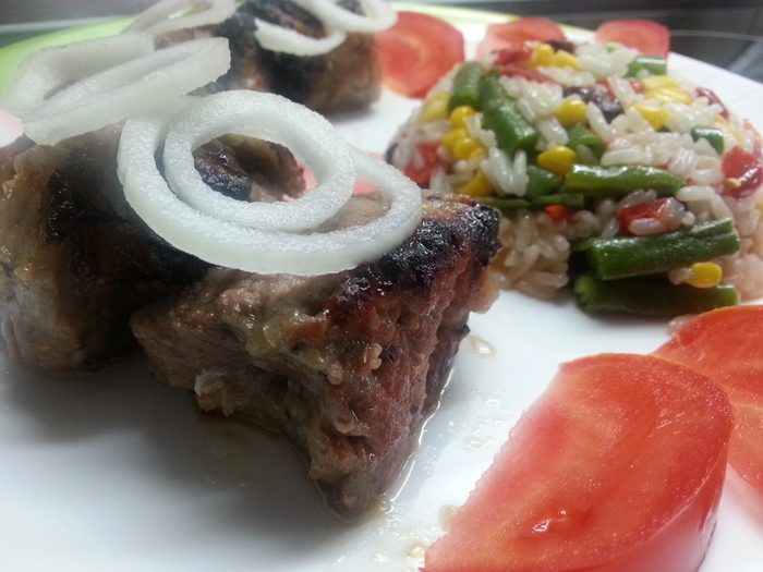 Я делаю — мясо, лук на терке, перец черный, давлю помидоры, если зимой помидор нет, разбавляю томатную пасту водой и заливаю — солю перед самой жаркой, на ночь в холодильник, а утром на часик можно с киви размешать, потом солить и в шашлычницу, у меня такая точно…