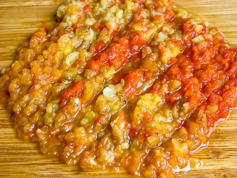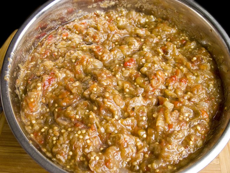 При разделке печеных овощей выделяется сок. Этот сок подобен нектару, который поглощали боги, когда жили на Олимпе. Так вот — старайтесь не терять ни капли этого сока, особенно это касается баклажанного сока и сока от перца. Помидорный сок иногда бывает в избытке, особенно, когда попадаются чересчур водянистые помидоры, его можно слить и добавлять в икру по мере её приготовления — по желанию, чтобы было гуще или пожиже.