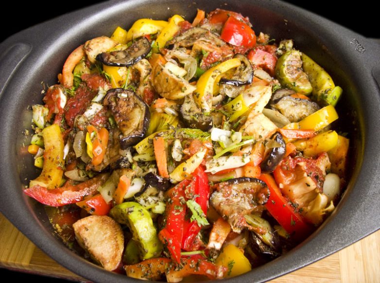 Когда все готово, жаровню с овощами, не закрывая крышкой, ставим в духовку разогретую до 170-180 градусов запекаться минут на 30.