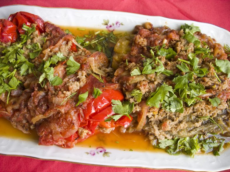 Вытаскиваем их на тарелку, разрезаем вдоль, раздвигаем половинки баклажанов и кабачков, чтобы туда вошло побольше фарша. Из перцев вытаскиваем хвостики — они вынимаются вместе с семенами, то, что остается — мизер, не вылавливайте их, они и не почувствуются. Овощной сок внутри перцев и баклажанов и вытекший в жаровне никуда, упаси бог, не выливайте — это одна из главных составляющих вкуса и прижарка на дне жаровни тоже.
