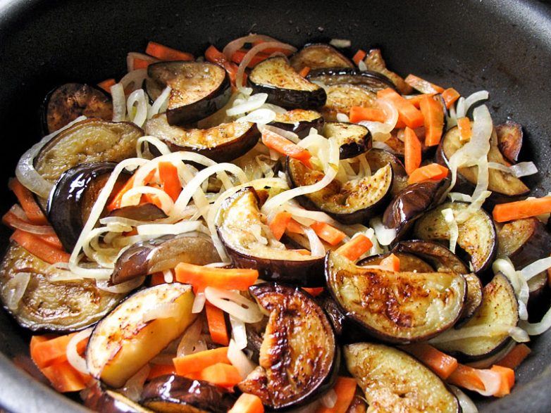 На подготовленный таким образом лук укладываем обжаренные баклажаны.