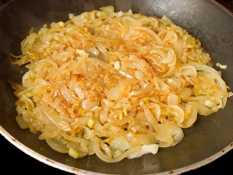 Лук готовится на медленном огне, помешивайте, чтобы не пригорел и когда он приобретет вот такой цвет, близкий к соломенному, можно считать, что он готов.