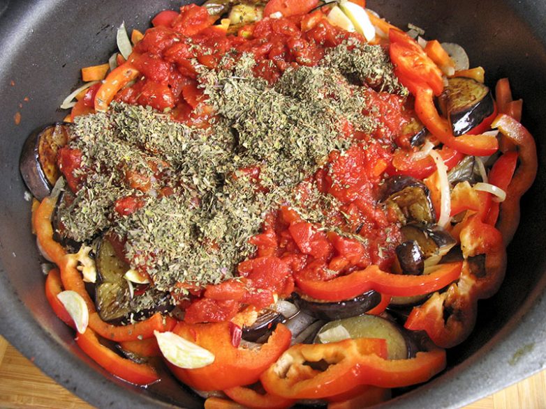 Поскольку в это время года найти свежий базилик сложно, можно воспользоваться сушеным. Понятно, что это эрзац, но все же лучше, чем ничего. На это количество овощей нужно примерно полторы столовых ложки сухого базилика.