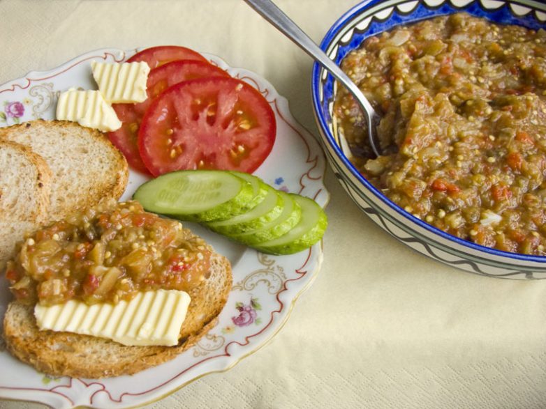 Положите себе порцию баклажанов или перцев или того и другого, кабачки не забудьте! Не забудьте также полить сверху все это вкуснейшим соком, посыпьте любимой зеленью и, взяв в руки кусок свежего хлеба, приступайте к трапезе. Если в вашей тарелке остался сок — макайте в него хлеб и ешьте — это деликатес.
