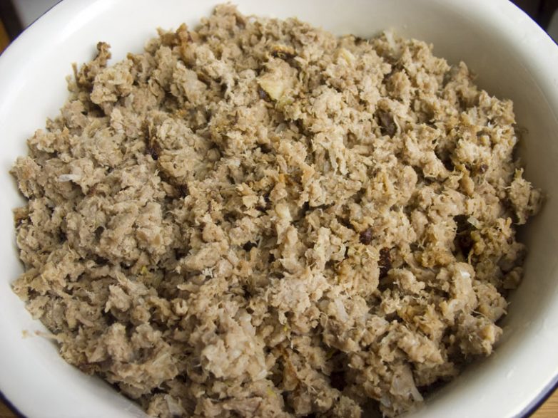 Вообще-то говоря, фарш делается очень просто — мясо перемалывается в мясорубке (у меня была говяжья лопатка, но можно взять и свинину, и баранину и даже индюшатину) и потом обжаривается в небольшом количестве масла. Я не люблю такой способ, потому что фарш получается крупинками, которые чувствуются на языке. Я отвариваю мясо в малом количестве жидкости или на парУ и потом пропускаю через мясорубку или блендер в импульсном режиме.