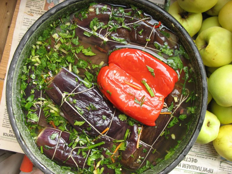 Сверху неплохо было бы поставить гнет, чтобы баклажаны немного спрессовать и выдавить ненужный нам воздух, отправить на балкон примерно на неделю, а потом разложить по меньшим емкостям и хранить в холодильнике. Есть вероятность, что турши прекрасно сохранится и без холодильника — например осенью на балконе, но я не пробовал так хранить.