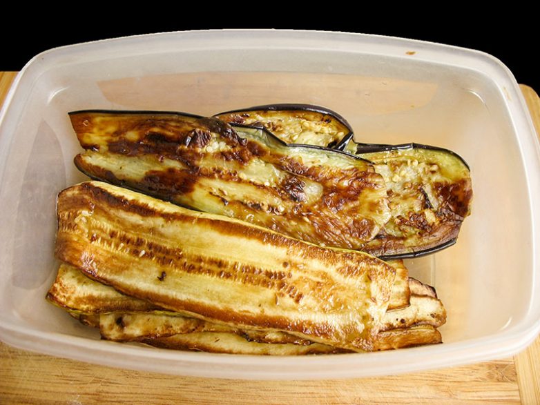 Этим соусом заливаем пожаренные пластинки, промазываем их со всех сторон и даем им постоять, чтобы чеснок набрал силу и овощи пропитались соусом. Если делаете это назавтра — то поставьте в холодильник, если поесть прямо сейчас, оставляете при комнатной температуре хотя бы на один час.