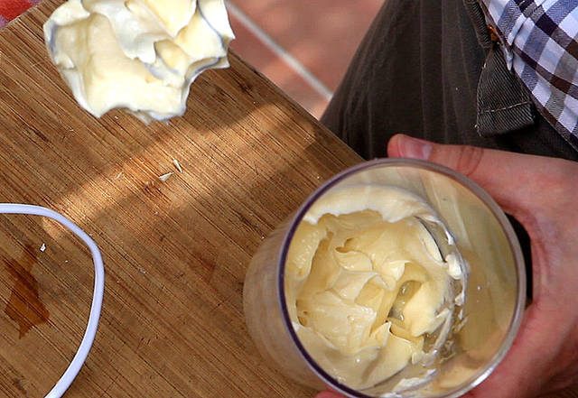 А дальше начинается работа блендером. Тут тоже не всё просто. Прежде всего, надо накрыть крыльчаткой блендера яйцо и «прижать» его ко дну стакана. И только после этого включать. Подождать, пока из-под крыльчатки не поползёт кремовая светлая эмульсия.