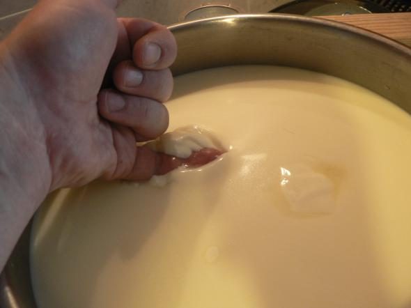 7. Проверяем готовность творога. Он должен быть похож на крем с четким разделением на творог и прозрачную сыворотку. Если сыворотка еще напоминает молоко, то оставьте творог еще на несколько минут. Делаем тест на «чистый палец». Это очень простой тест: надо просто обмакнуть палец (чистый!:) ) в творожную массу и посмотреть на него. Если на пальце остается белая молочная масса, то творог еще не готов. Если палец остается чистый, то готовность творога гарантирована.